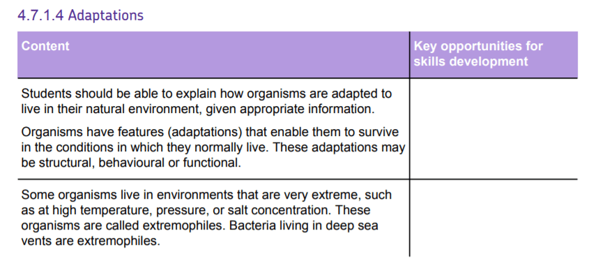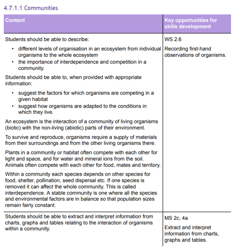 The trilogy specification orders biology content with Inheritance, Variation And Evolution (IVE) before Ecology. While a specification should not be considered a suggested route through, there is some logic to this. Understanding adaptation and competition might be easier with a good understanding of evolution, DNA and mutation. The other main option is to put Ecology at the end of year 10/ beginning of year 11. This is often chosen for pragmatic reasons, the field work is better in the summer and ecology has an important required practical that is often assessed.