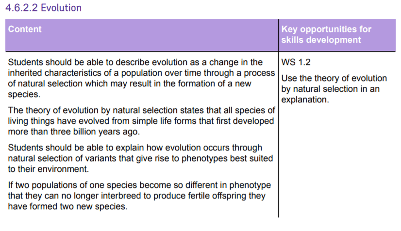 Here I want to draw in the evidence from fossils and antibiotic resistance to show a variety of time scales and ensure students understand they do not need to consider the theory’s validity in this topic.