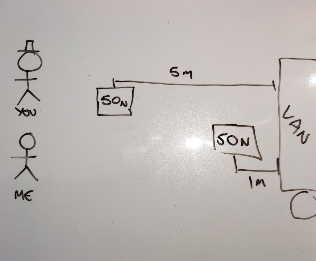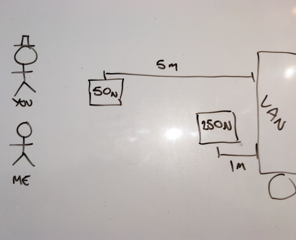 So the following day we go to work and we find ourselves in a similar situation. This time however the boxes are the same weight but different distances. *rubs out boxes and draws as below*