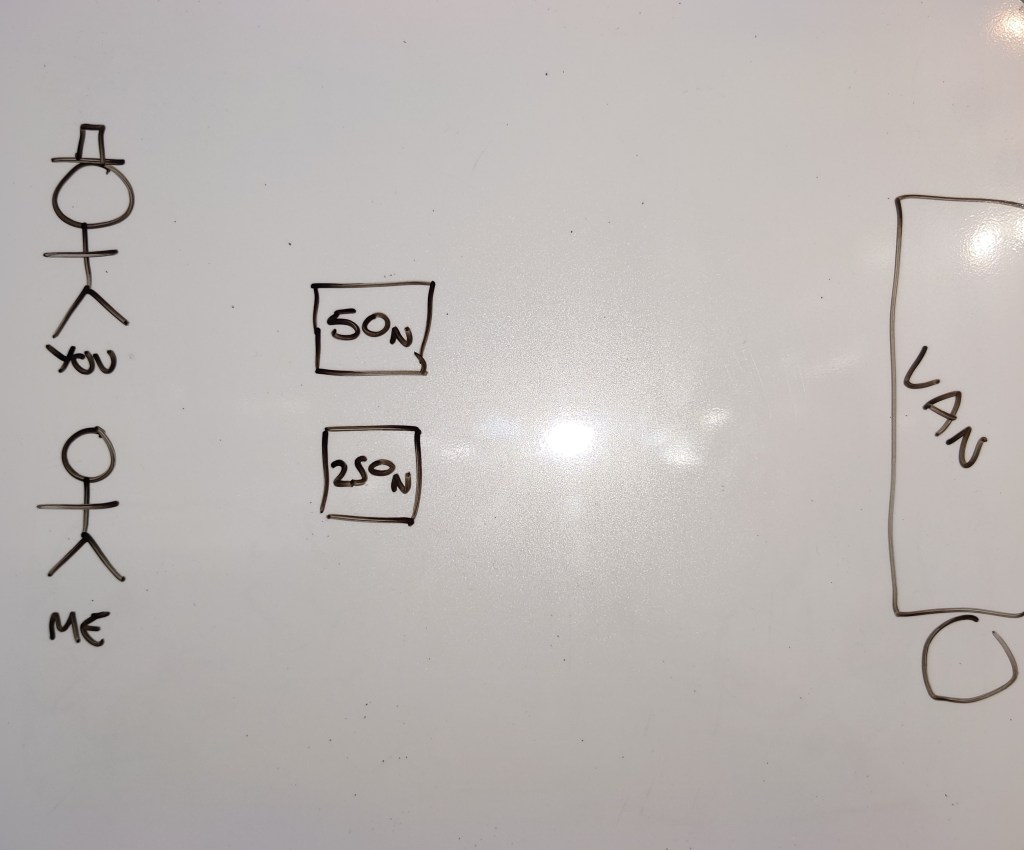 We are on a job, here we are *draws stick figures* you’re the boss so you get to wear the hat, and here is our van *draws van* and we have two boxes left to carry to the van. Now you have to choose which box you want to carry. Now here are the boxes, *draws boxes* they are both the same distance away, 5m, but they have different weights. Take a look at the boxes and decide which one you want to carry and which one you are going to make me carry.